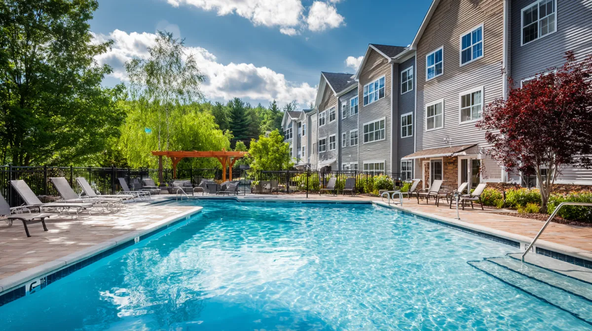 A modern pool area offers a refreshing retreat framed by natural textures and shaded seating. It’s a peaceful place to unwind on warm days and enjoy the beauty of the outdoors.